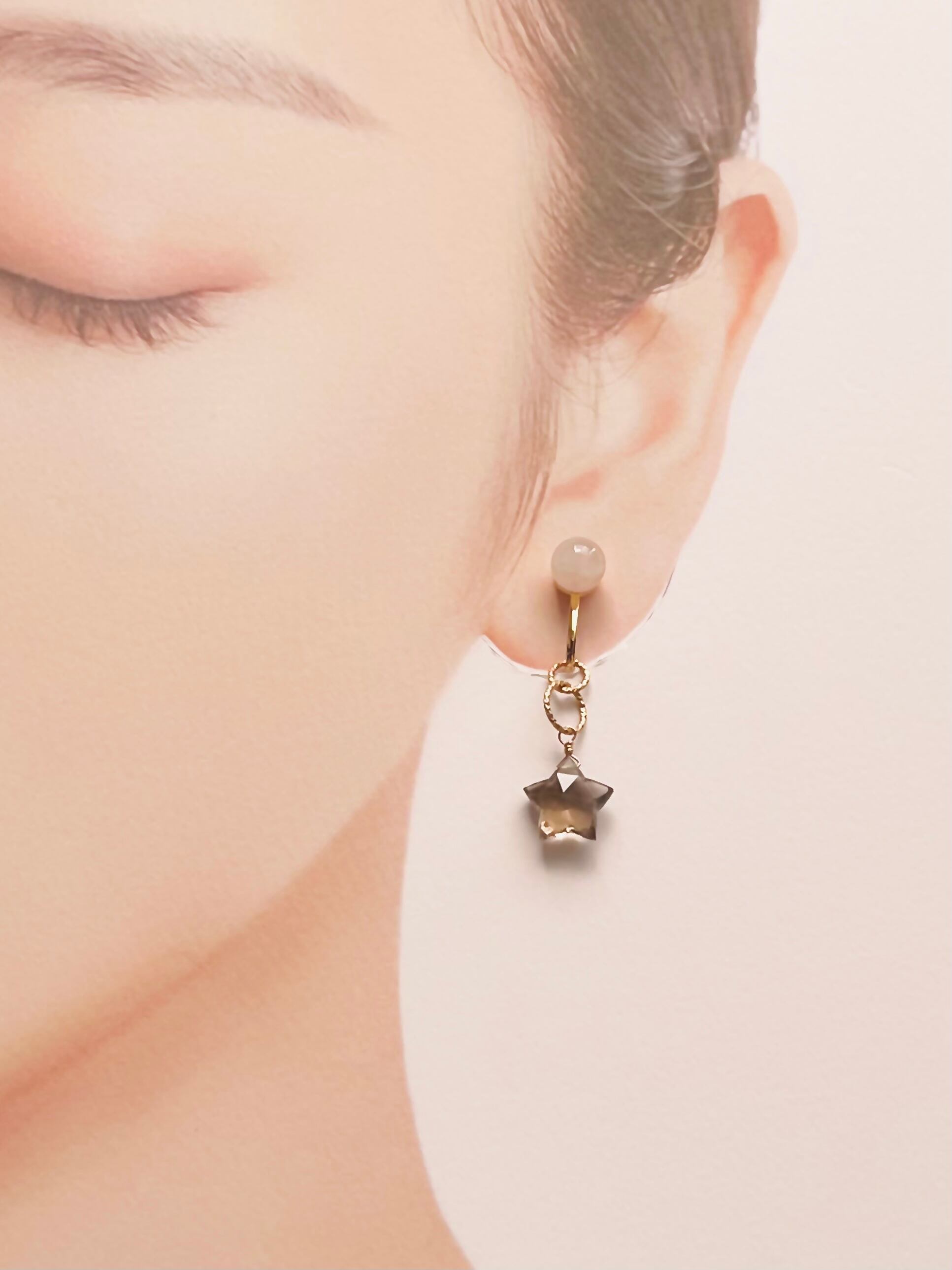 星型にカットされたキラキラ輝くスモーキークォーツと、優しいピンクが可愛らしいローズクォーツのイヤリングです⭐︎