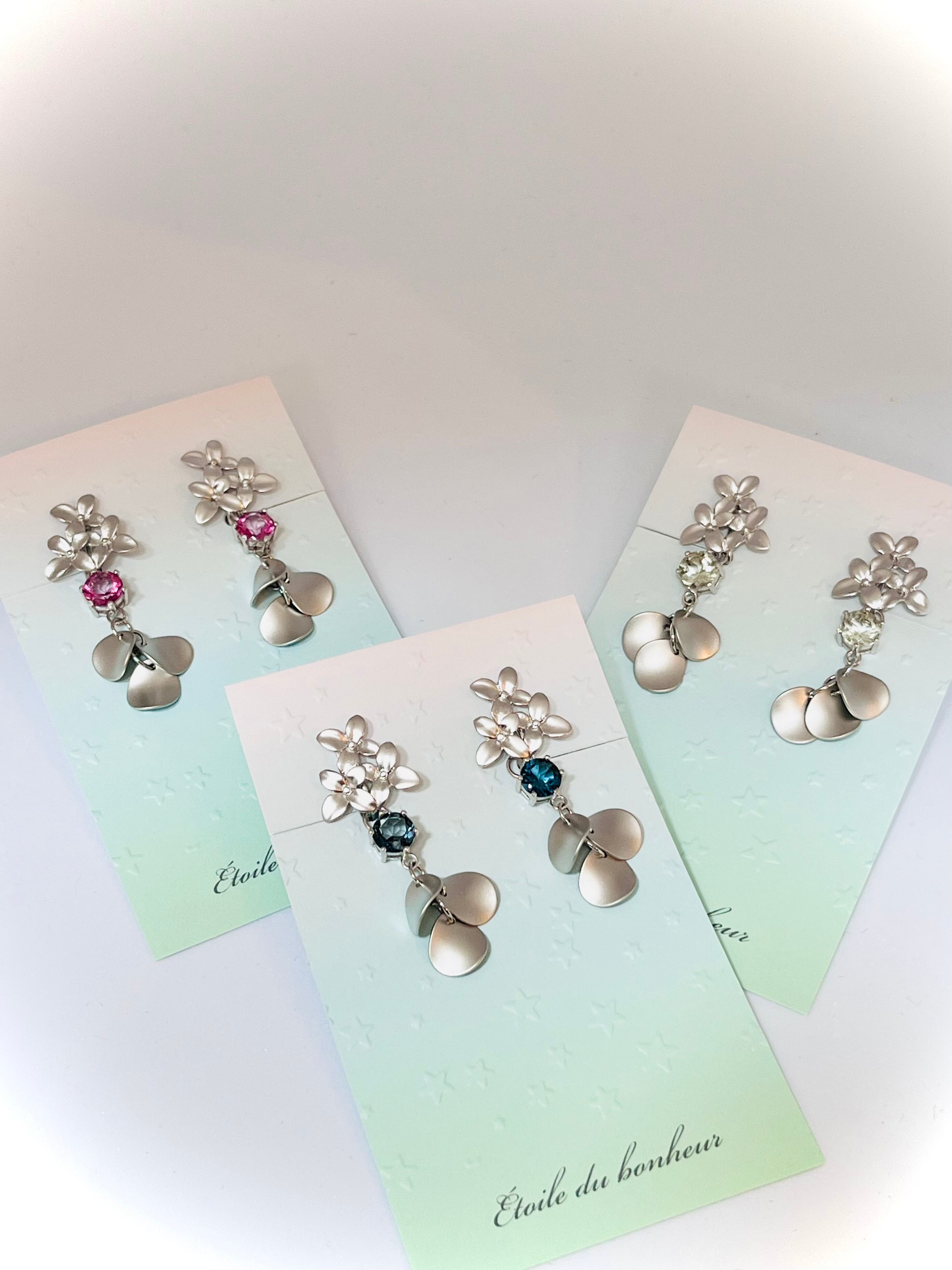 ラベンダーを3つ集めた落ち着いたカラーのマットシルバーイヤリングは、エレガントで上品なデザインが特徴です。瑞々しいグリーンアメジストが耳元で輝きを放ち、花びらを表現した揺れるデザインは女性らしさを引き立ててくれます。